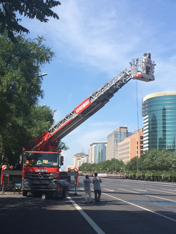 位于長安街南側(cè),人民大會堂附近的是亞洲目前**高的云梯消防車,型號為YT60的中聯(lián)重科60米云梯消防車。它主要承擔(dān)了兩項(xiàng)重要任務(wù),前期主要配合QY80起重機(jī)進(jìn)行“天鷹座”的牽線工作;而在慶典當(dāng)天,央視工作人員在YT60撐起的工作斗里進(jìn)行現(xiàn)場拍攝,電視中許多天安門城樓上領(lǐng)導(dǎo)、嘉賓以及受閱部隊(duì)通過天安門前的正面鏡頭就是由它捕捉的。