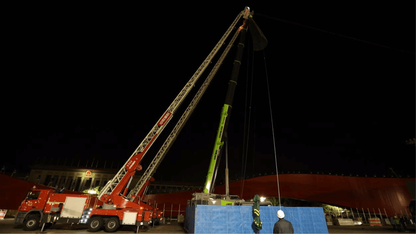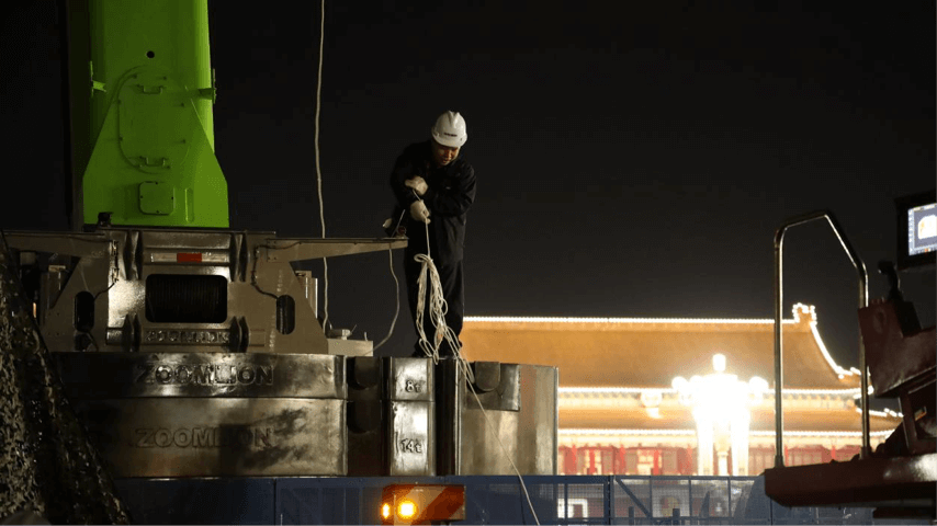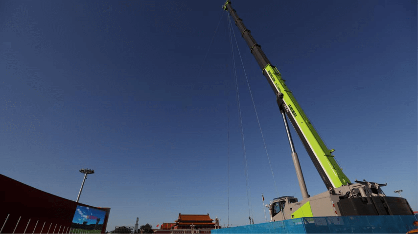 ▲中聯(lián)重科汽車起重機聳立在天安門廣場架設天鷹座拍攝系統(tǒng)助力大慶直播