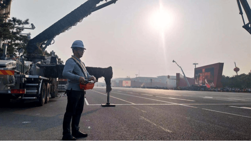 此外,為呈現(xiàn)慶典活動隊伍整裝待發(fā)、行進的全過程,央視拍攝團隊還精選了中聯(lián)重科40米泵車和53米云梯消防車作為長安街沿線的高機位支撐。其中,40米泵車被改裝為“大搖臂攝像機”,這個機位通過空間的壓縮可以將所有閱兵隊伍在一個鏡頭畫面中呈現(xiàn)。拍攝過程中,需在90秒內調整至多種姿態(tài)和高度進行拍攝,中聯(lián)重科泵車嚴絲合縫精準操作,以極致的響應速度和穩(wěn)定性滿足了臂端攝像機的拍攝需求,為觀眾清晰地呈現(xiàn)了精彩、壯觀的畫面。