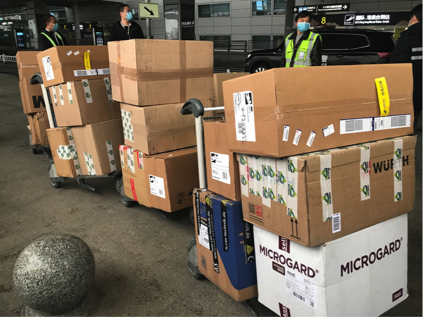 △中聯(lián)重科海外員工在法蘭克福機(jī)場(chǎng)準(zhǔn)備發(fā)送防護(hù)物資