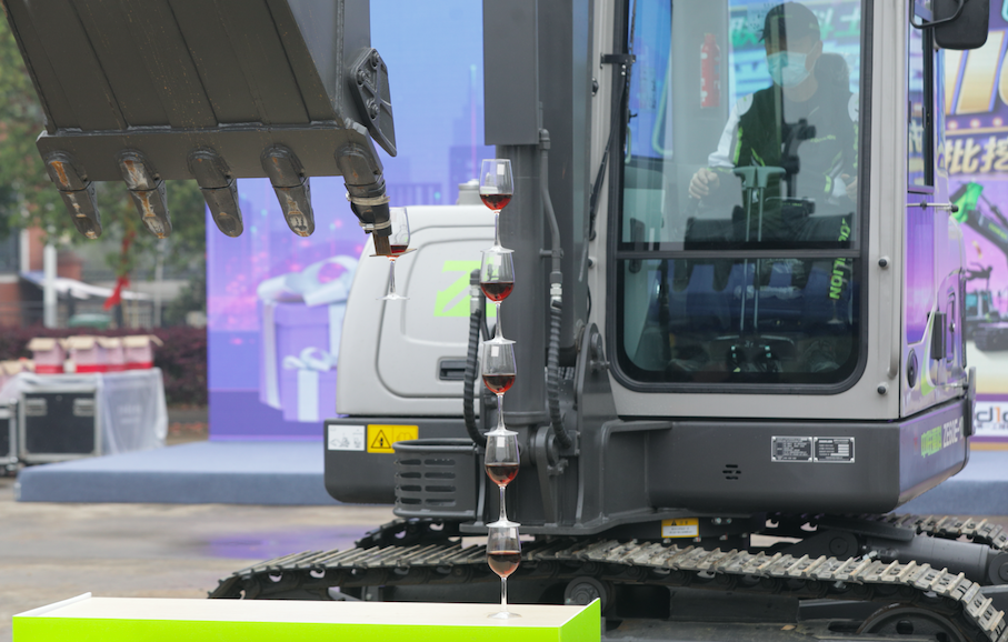 △中聯(lián)重科產(chǎn)品經(jīng)理結(jié)合ZE60E-10挖掘機(jī)疊高腳杯表演講解產(chǎn)品性能