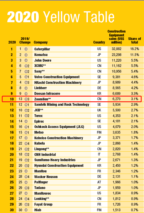 ? ?近日,英國(guó)KHL集團(tuán)發(fā)布了一年一度的全球工程機(jī)械制造商50強(qiáng)排行榜《2020 Yellow Table》。榜單顯示,中聯(lián)重科以60多億美元的銷售總額位列榜單前十強(qiáng),充分凸顯了中聯(lián)重科近年來(lái)取得的高質(zhì)量、高效率、可持續(xù)發(fā)展成果。