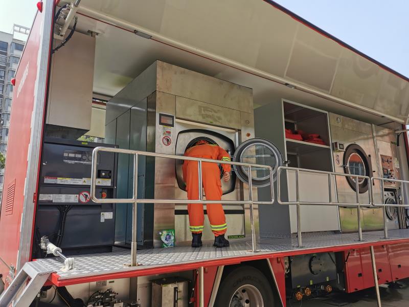 據(jù)介紹,中聯(lián)重科大型被服洗滌車結(jié)合洗滌設(shè)備特點(diǎn)和應(yīng)急救援實(shí)戰(zhàn)中衣物洗滌需求創(chuàng)新設(shè)計(jì)而成。被服洗滌車工作能力強(qiáng)大,單次工作(約一小時)**大可洗脫、烘干100kg衣物,能將臟衣物快速處理成潔凈、干爽的衣物。同時,車輛采取獨(dú)有專利技術(shù),全程一鍵控制,自動選擇洗滌參數(shù),滿足多種消防衣物洗烘需求,快捷高效。此外,車輛還擁有舒適的工作環(huán)境,裝備了超靜音發(fā)電機(jī)和靜音水泵,有效降低工作噪聲。作業(yè)空間大,超大儲物容積可滿足多種儲存需求。