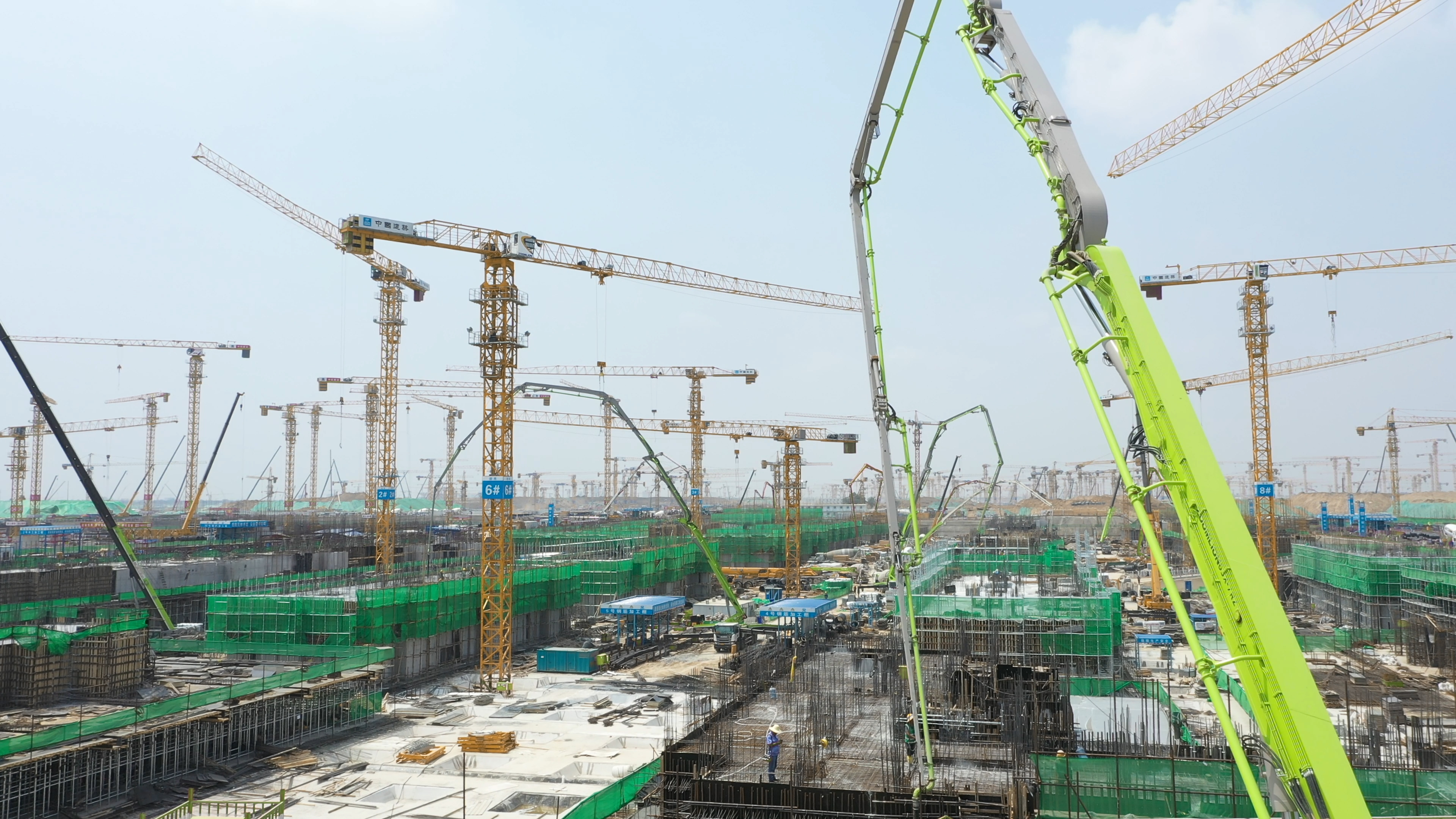 盛夏雄安,烈日炎炎,在廣大建設(shè)者拼搏奮斗下,雄安新區(qū)各重大項(xiàng)目建設(shè)捷報(bào)頻傳:京雄城際鐵路雄安站站房橢圓形水滴狀造型初現(xiàn),容東片區(qū)安置房及綜合管廊等工程均按時(shí)按質(zhì)完成節(jié)點(diǎn)任務(wù),雄安商務(wù)服務(wù)中心會(huì)展中心工程主體結(jié)構(gòu)7月底已封頂。在這座“未來之城”的建設(shè)現(xiàn)場(chǎng),中聯(lián)重科塔機(jī)林立、混凝土機(jī)械、汽車起重機(jī)等各類設(shè)備成群作業(yè),熱火朝天的建設(shè)圖景甚為壯美。