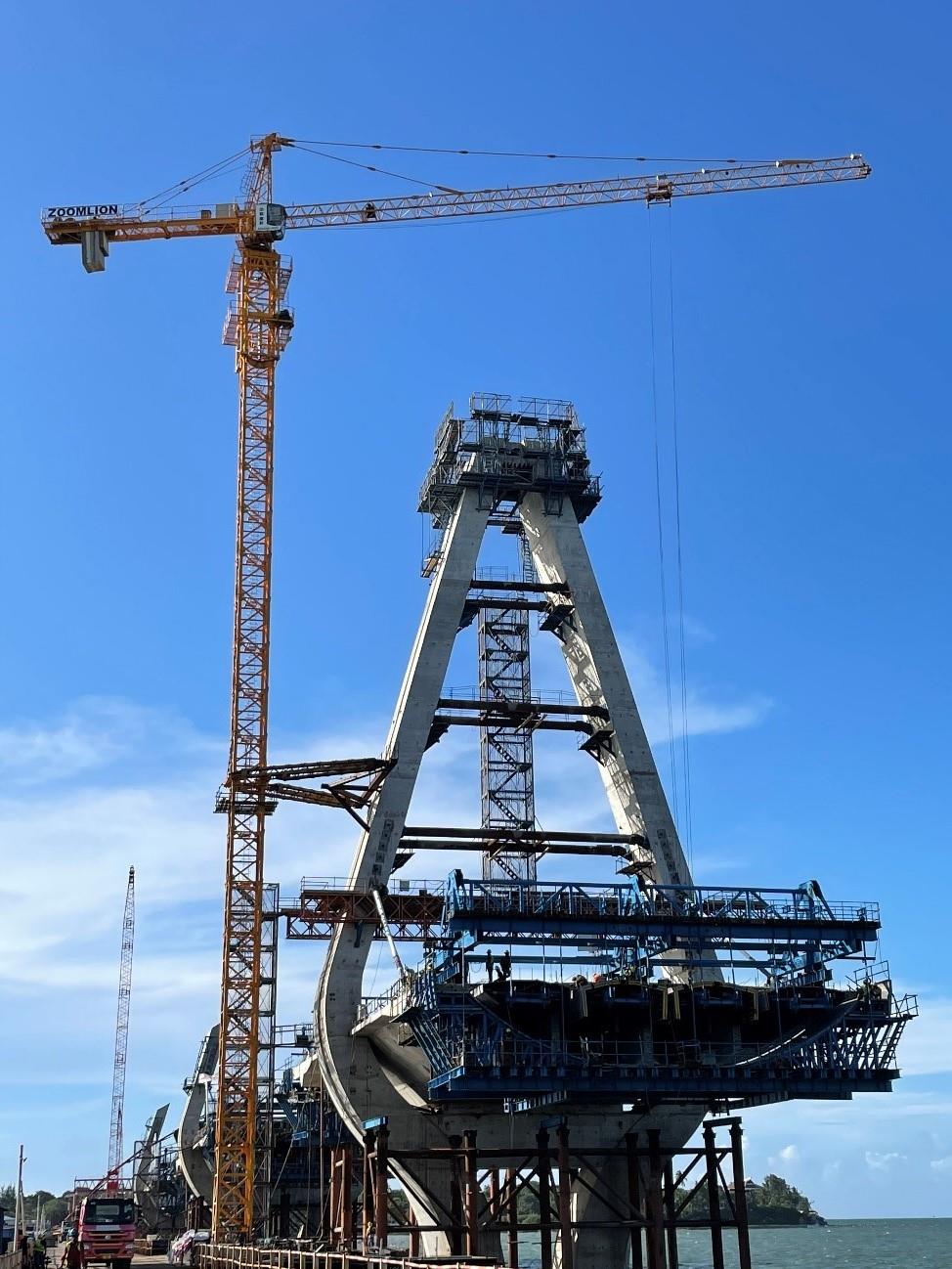 憑借著輕載高速、重載低速的技術(shù),中聯(lián)重科TC7013-10E塔機穩(wěn)定、高效地完成了新塞蘭德跨海大橋橋墩的每一次吊裝。2021年,大橋中塔柱塔頂合龍段混凝土順利澆筑完成,至此,五個主墩塔柱全部封頂。這預(yù)示著中聯(lián)重科兩臺塔機圓滿完成了主要的橋墩吊裝任務(wù),為大橋今年建成通車奠定了堅實基礎(chǔ)。