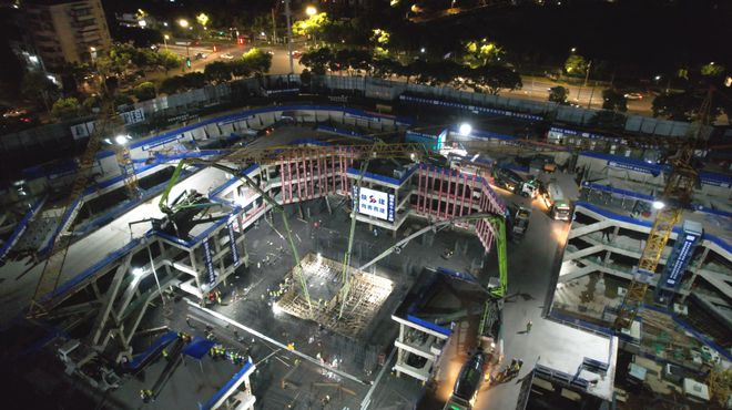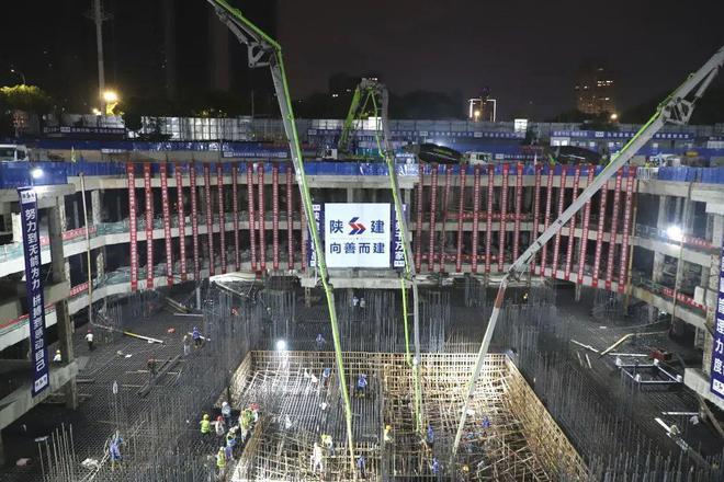 該項目基坑深度近20米,筏板**厚處為7.55米,整個基礎底板澆筑工程采用多點同時澆筑,從中心向四周,由深到淺,斜面分層施工,整體一次完成澆筑。為應對跨晝夜深基坑連續(xù)作業(yè),項目方經過多方對比,**終選擇中聯重科設備承擔重任。