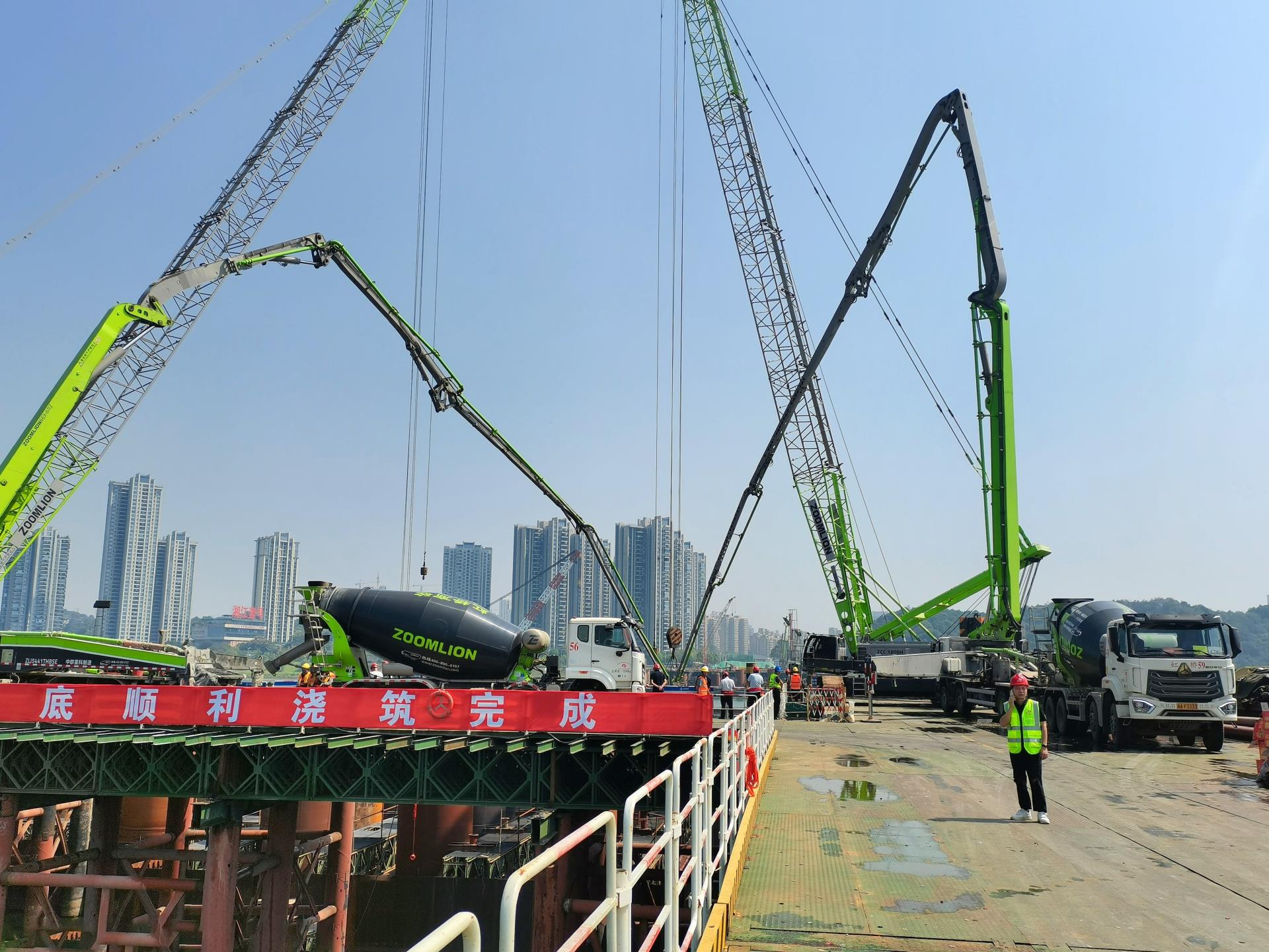 其主墩承臺(tái)設(shè)計(jì)為深埋式“啞鈴型”,鋼圍堰封底工作是**關(guān)鍵、也是連續(xù)作業(yè)時(shí)間**長(zhǎng)的工序。為確保澆筑品質(zhì)和效率,施工方經(jīng)多方對(duì)比,**終選擇了中聯(lián)重科“凌云”系列泵車來(lái)完成任務(wù)。操作機(jī)手也對(duì)中聯(lián)重科的泵車情有獨(dú)鐘:“中聯(lián)的泵車臂架一直都很穩(wěn),打料快、油耗也低!”