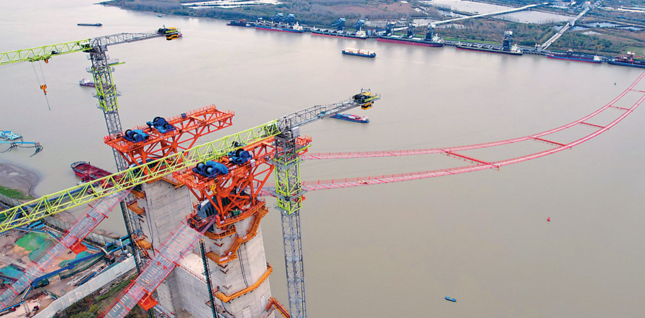 在長(zhǎng)江上施工,大跨度和持續(xù)高空作業(yè)環(huán)境對(duì)施工安全構(gòu)成極大挑戰(zhàn)。據(jù)了解,此次助力施工的是兩臺(tái)中聯(lián)重科W450-25HC平頭塔機(jī),除了具備優(yōu)異的起重性能,起重量三重保護(hù)、力矩雙重保護(hù)、電控系統(tǒng)智能檢測(cè)保護(hù)和全新變頻回轉(zhuǎn)系統(tǒng)等功能讓設(shè)備在江邊和高空環(huán)境下也具備極致的操控性和可靠度。