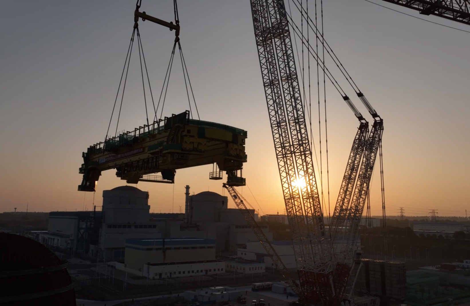 據(jù)了解,環(huán)吊是安裝在反應(yīng)堆廠房內(nèi)上部位置的重型起重設(shè)備,在核電廠建造階段,環(huán)吊用于安裝反應(yīng)堆廠房內(nèi)的重型設(shè)備,如蒸汽發(fā)生器、反應(yīng)堆壓力容器、穩(wěn)壓器、堆內(nèi)構(gòu)件等設(shè)備,在核電廠運行階段,環(huán)吊用于反應(yīng)堆停堆換料和反應(yīng)堆廠房內(nèi)設(shè)備維修所需的各種服務(wù)。
