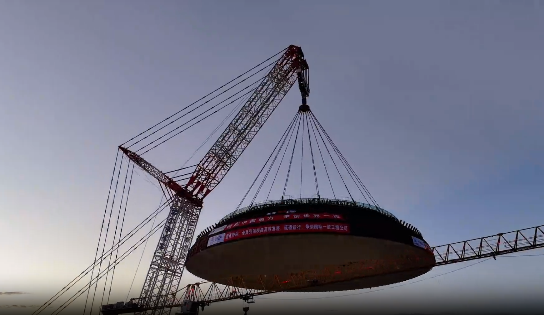 此次吊裝的外穹頂模塊吊裝負(fù)載總重量約為600噸,外穹頂結(jié)構(gòu)具有大尺寸、大重量且薄壁板的特性,吊裝過程極易產(chǎn)生形變導(dǎo)致就位困難,中聯(lián)重科3200噸履帶起重機(jī)以毫米級的吊裝精度和平穩(wěn)高效的吊裝動作,將昌江核電二期3號機(jī)組外穹頂精準(zhǔn)地落在預(yù)定位置。