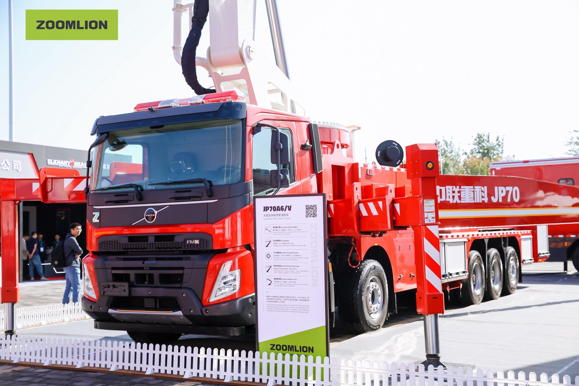 ▲中聯(lián)重科全球**高70米大跨距舉高噴射消防車(chē)