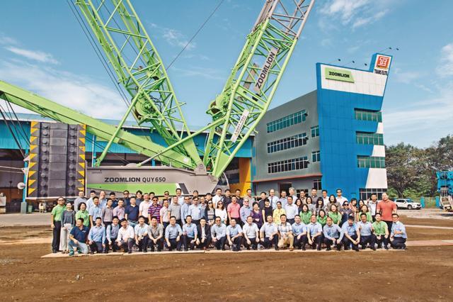 ▲中聯(lián)重科東南亞代理商在QUY650履帶起重機前合影留念